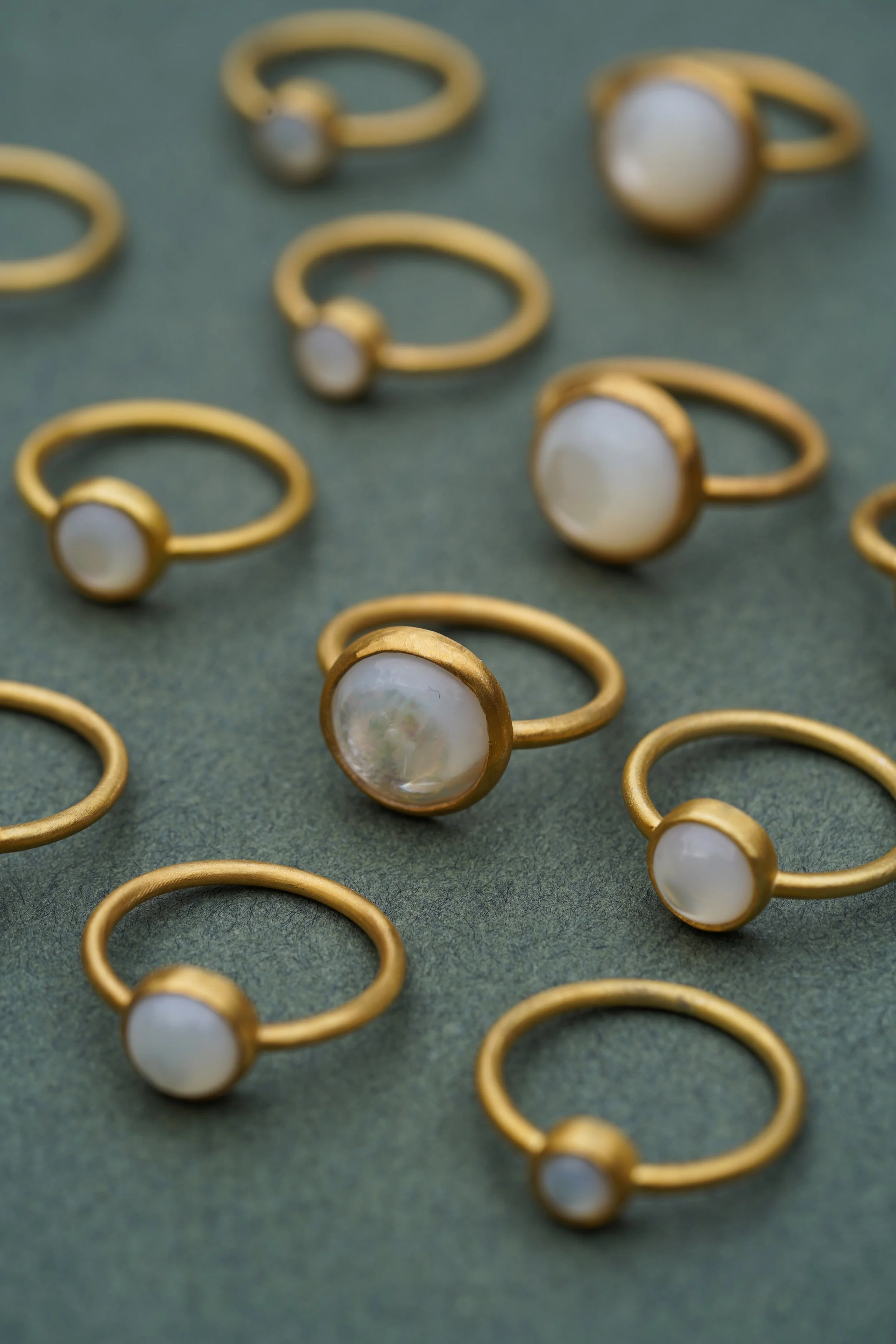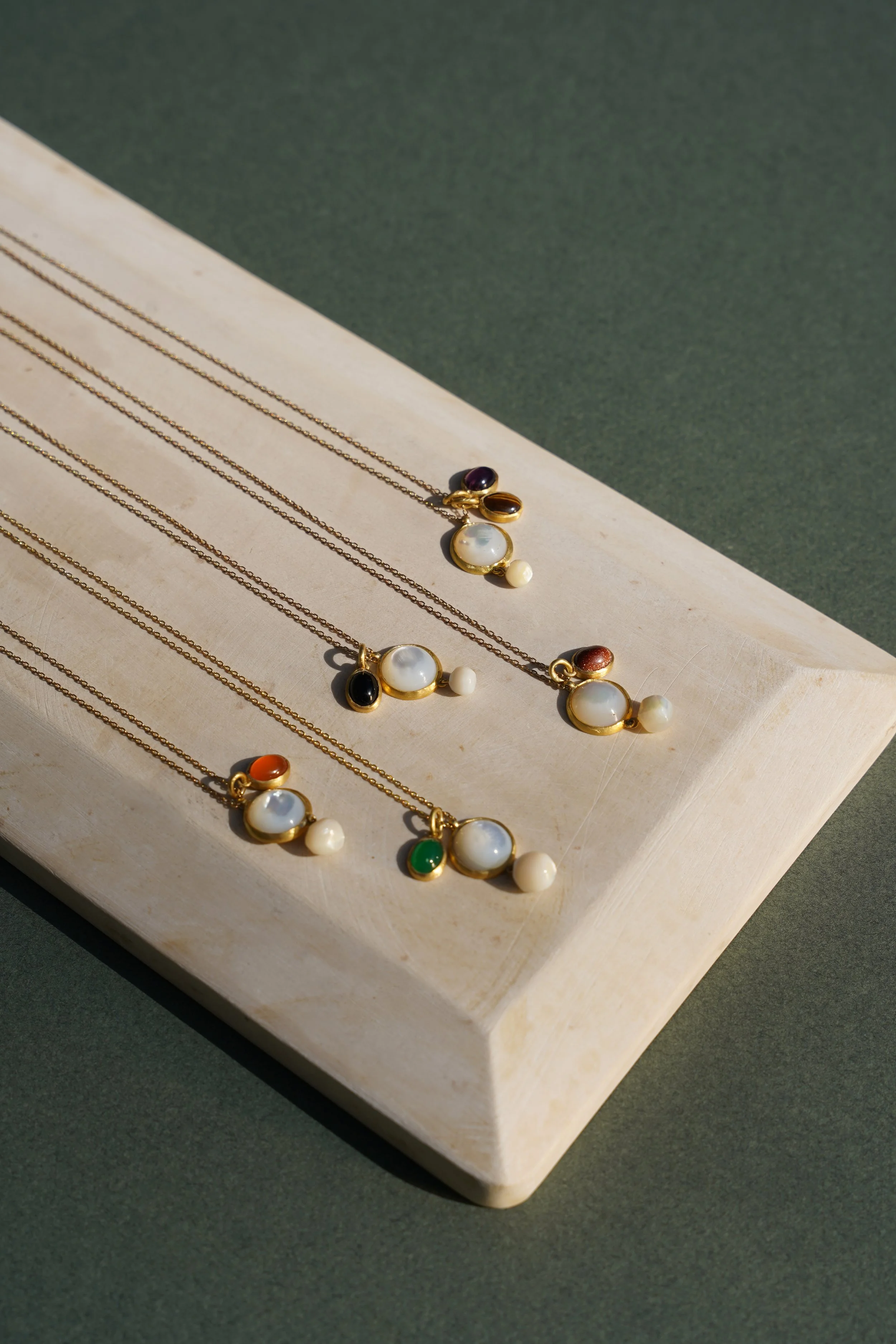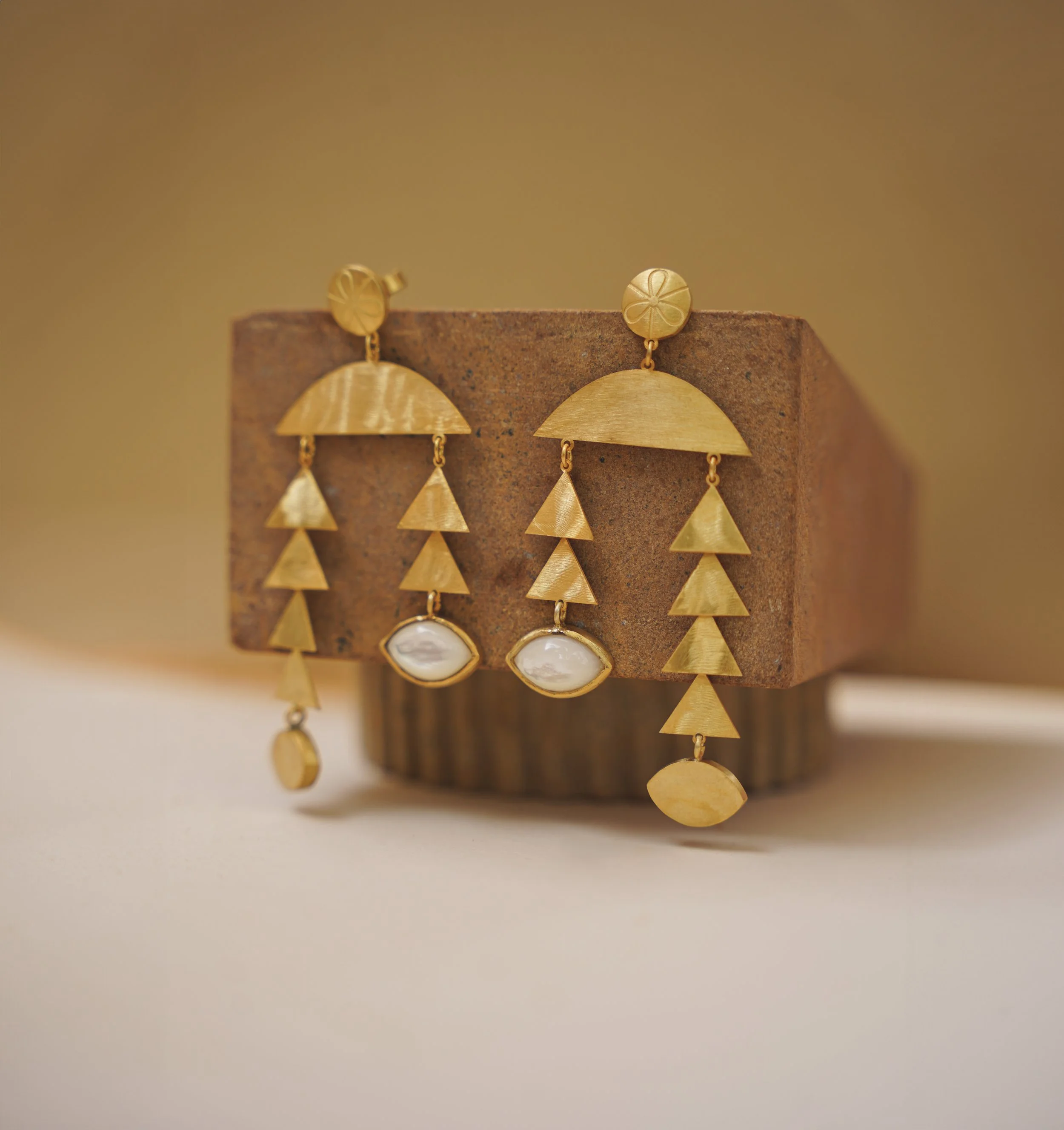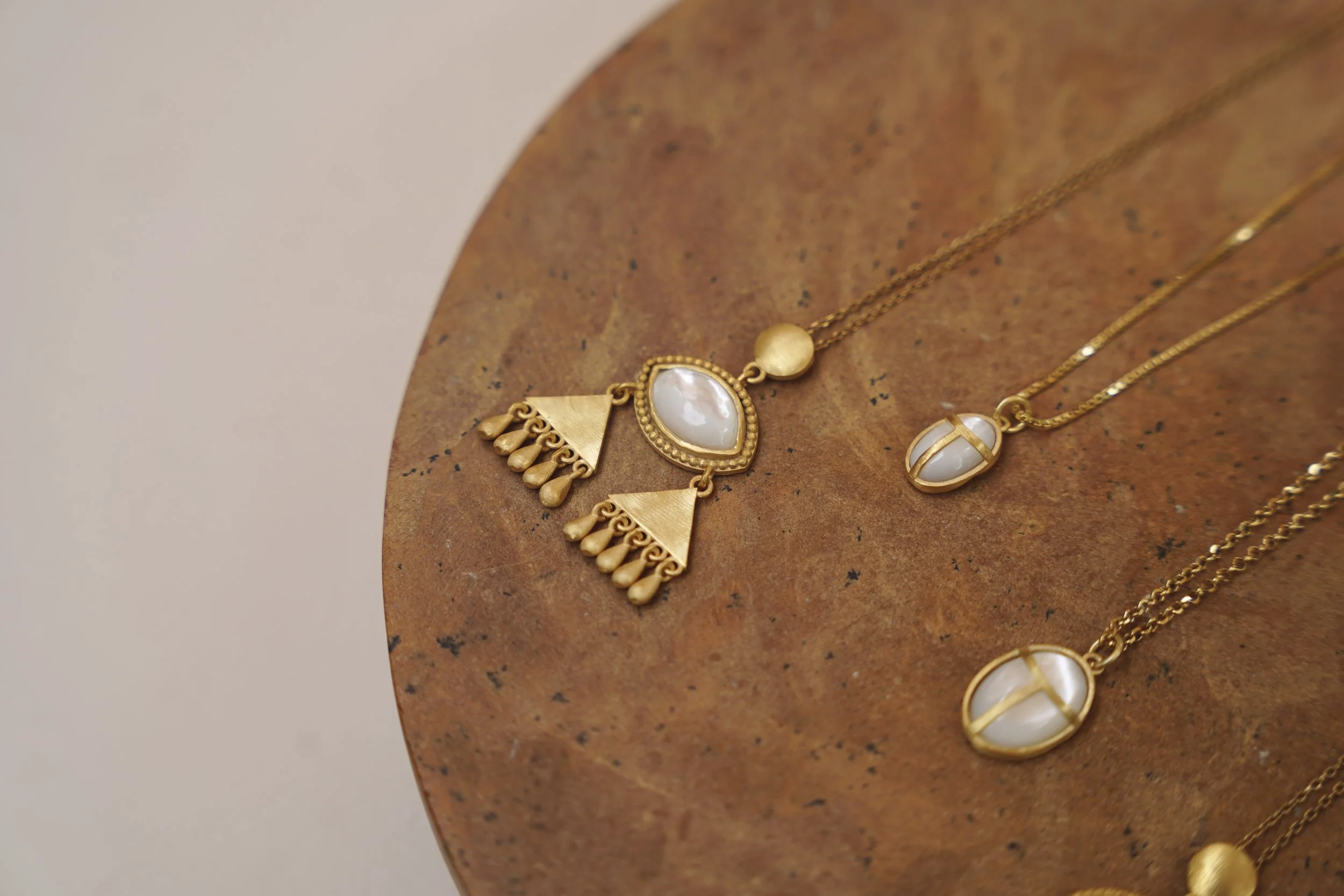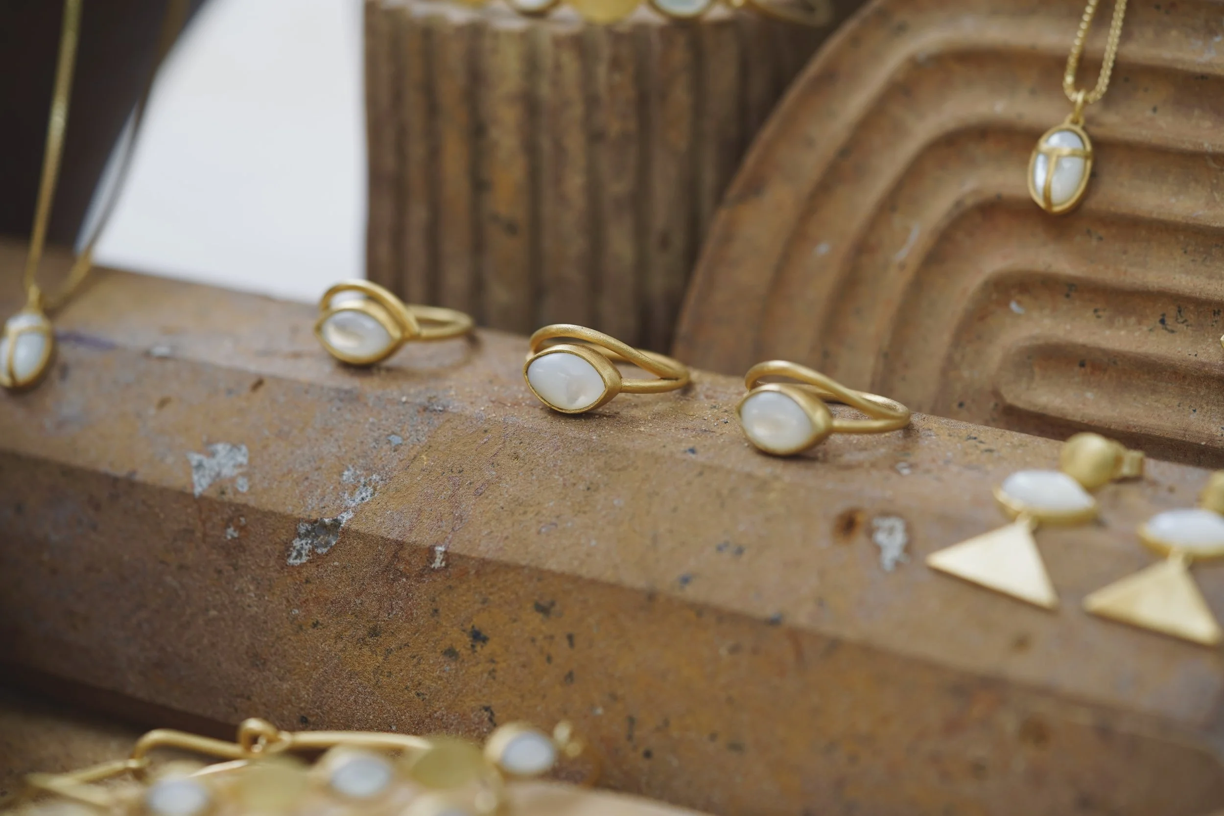 I have designed these collections in 2023 when I was leading the jewellery department at Turquoise Mountain. Both these collections are made with the same concept; incorporating mother of pearl, as a material that is widely used among Syrian artisans in Jordan, in jewellery. This time, instead of inlaying mother of pearl as embellishment for woodworks, it would be carved and set in silver as a gemstone.