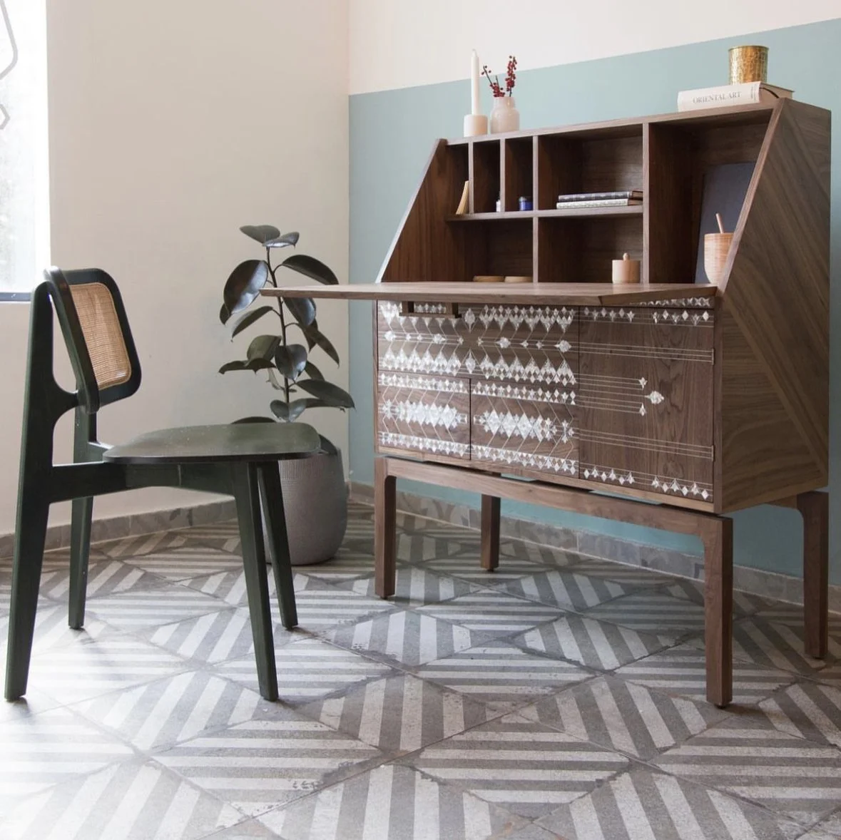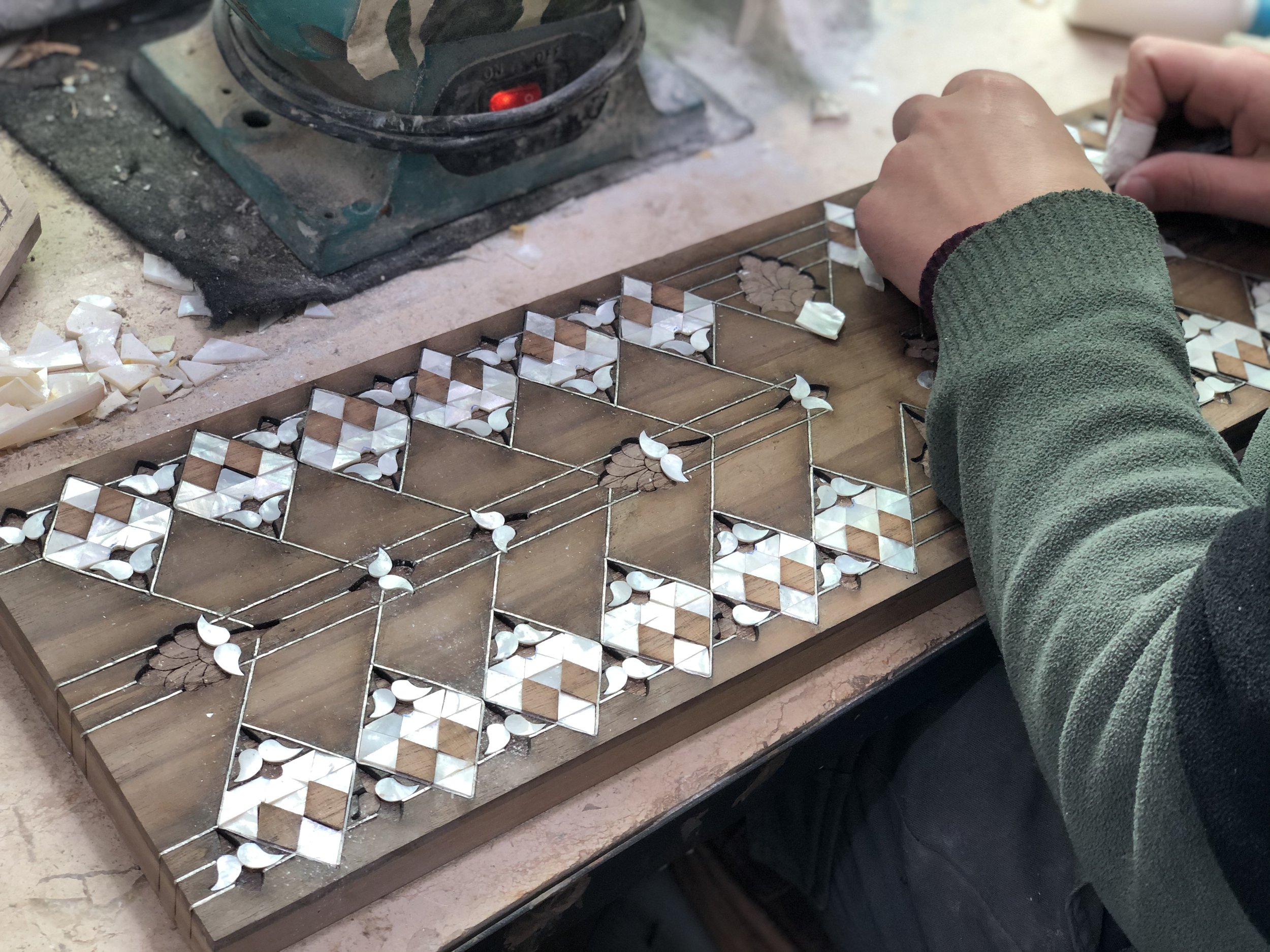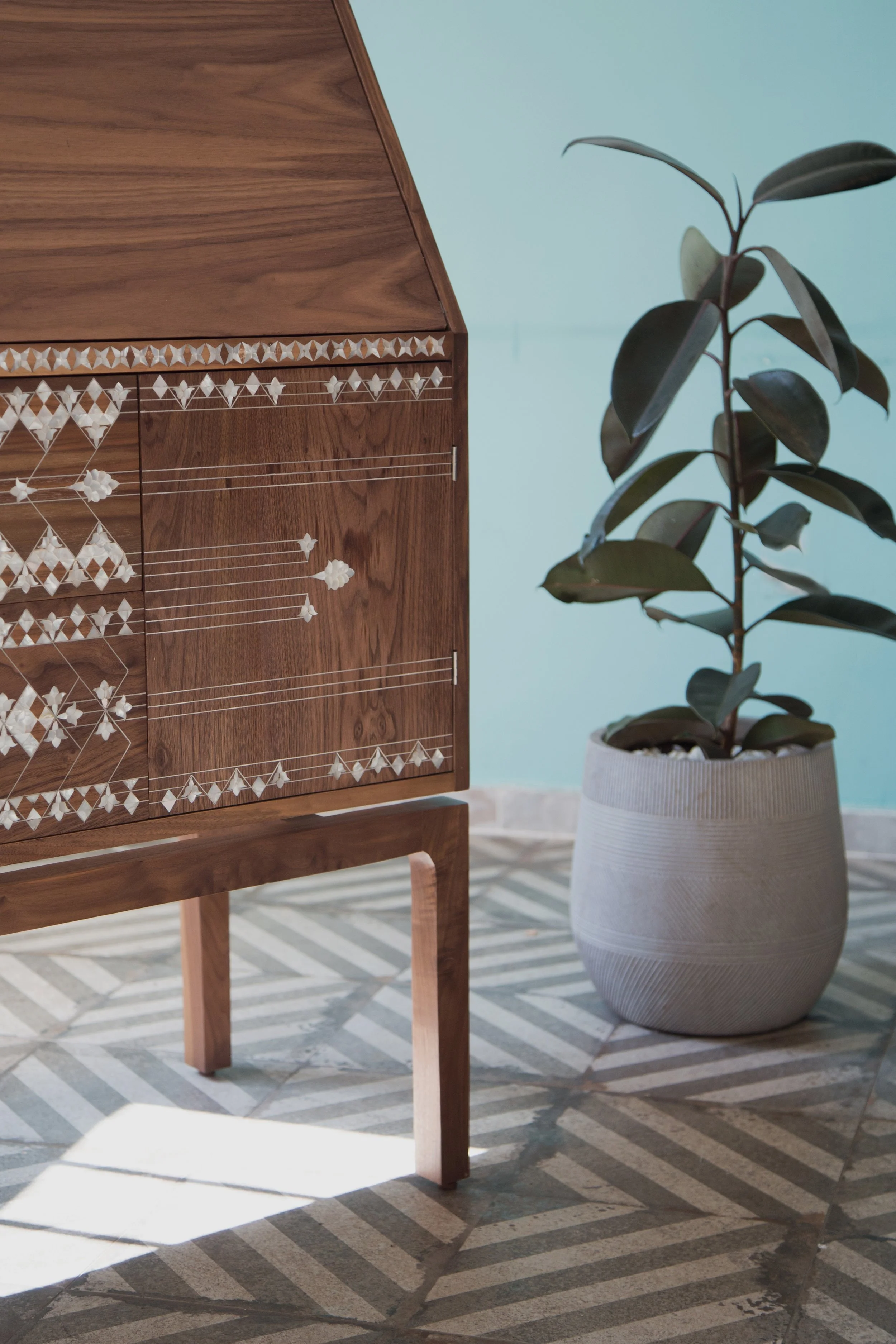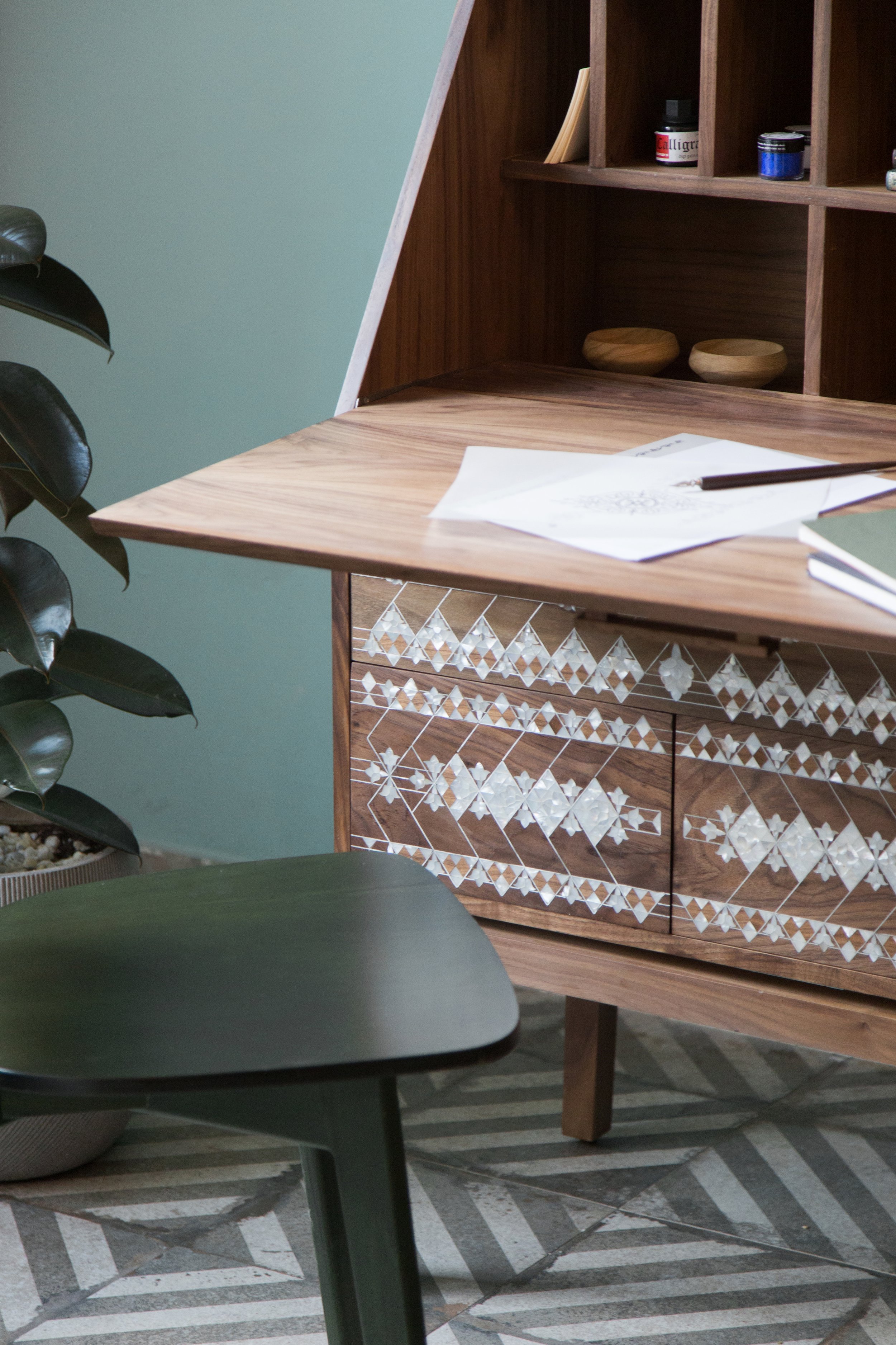 This secretary desk was designed as part of the “From concept to store” program, implemented by Turquoise Mountain with the support of UNICEF in 2021. The program was comprised of a team of a woodwork apprentice, a desiger and a master woodwork artisan to design and produce a handmade furniture piece that would later be showcased in the showroom of Turquoise Mountain. The desk’s form and pattern were telling the story of a shared nostalgic experience of the designer and the apprentice.