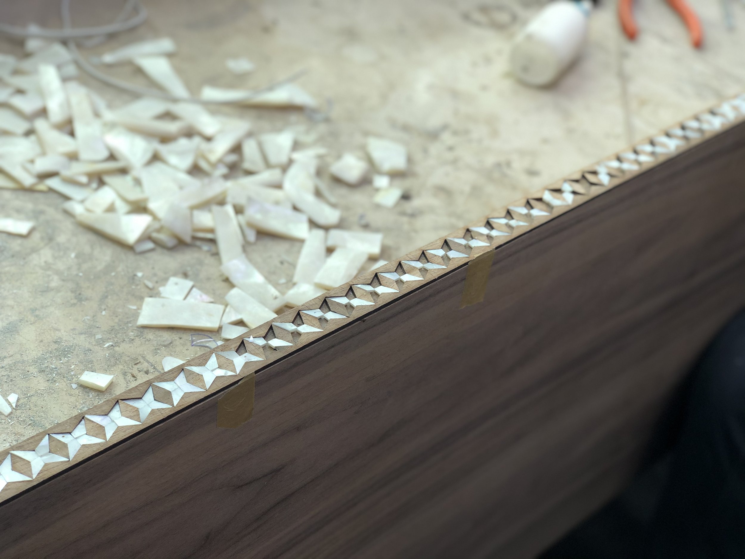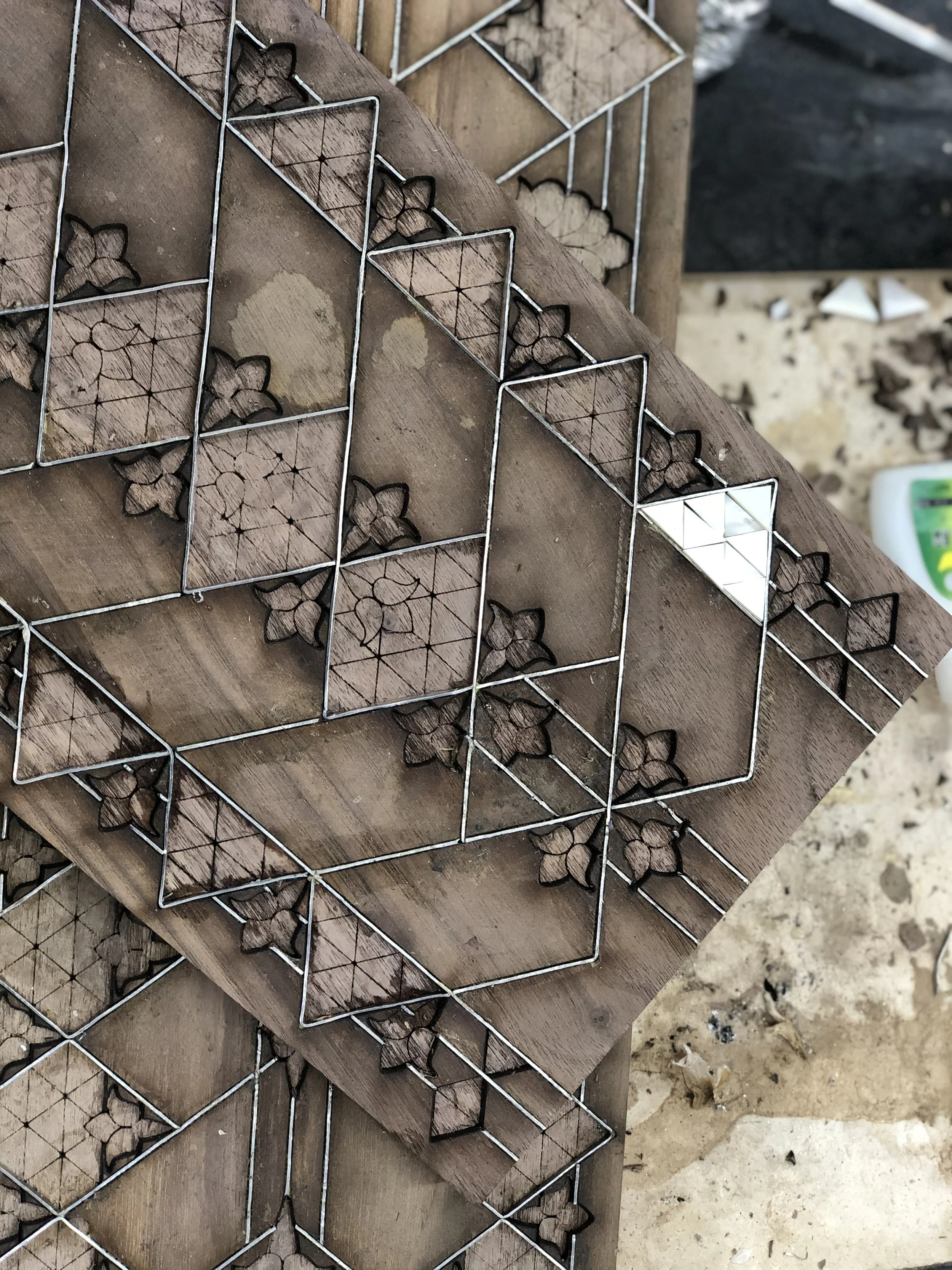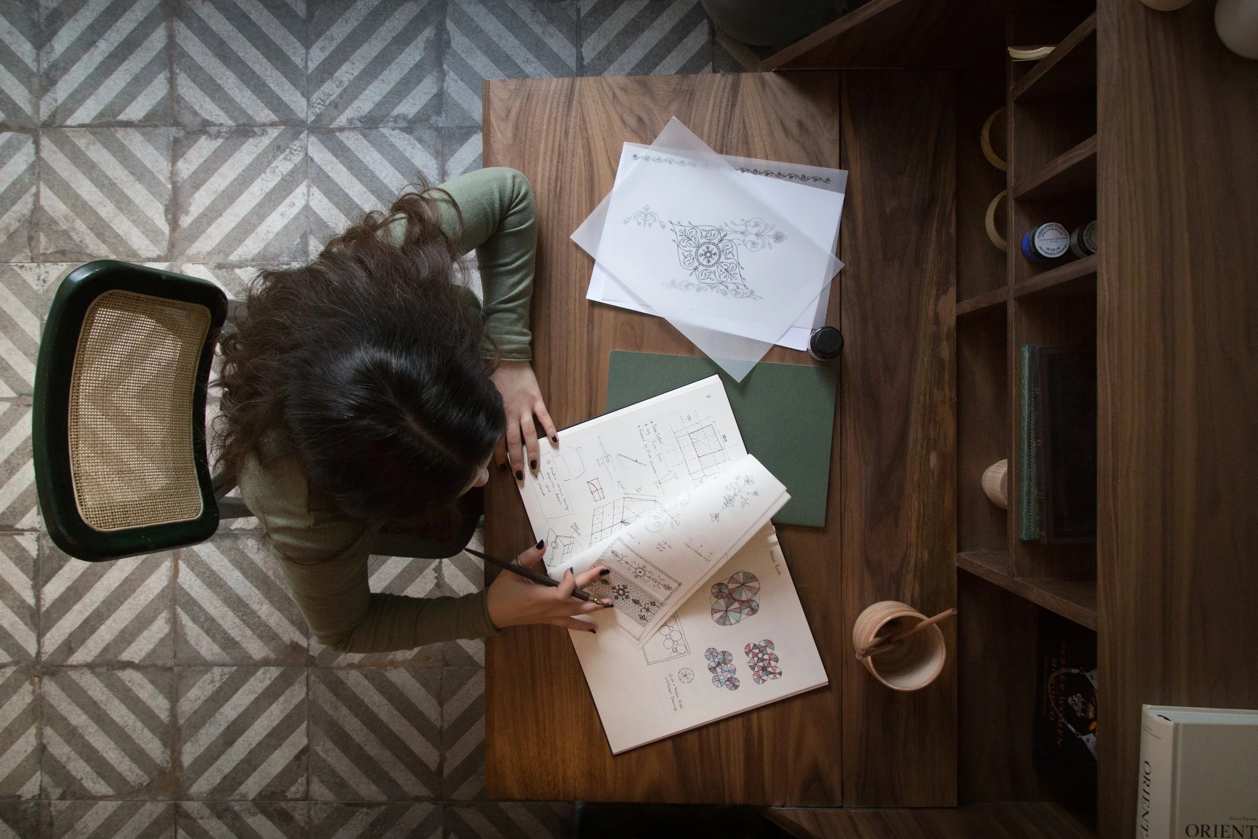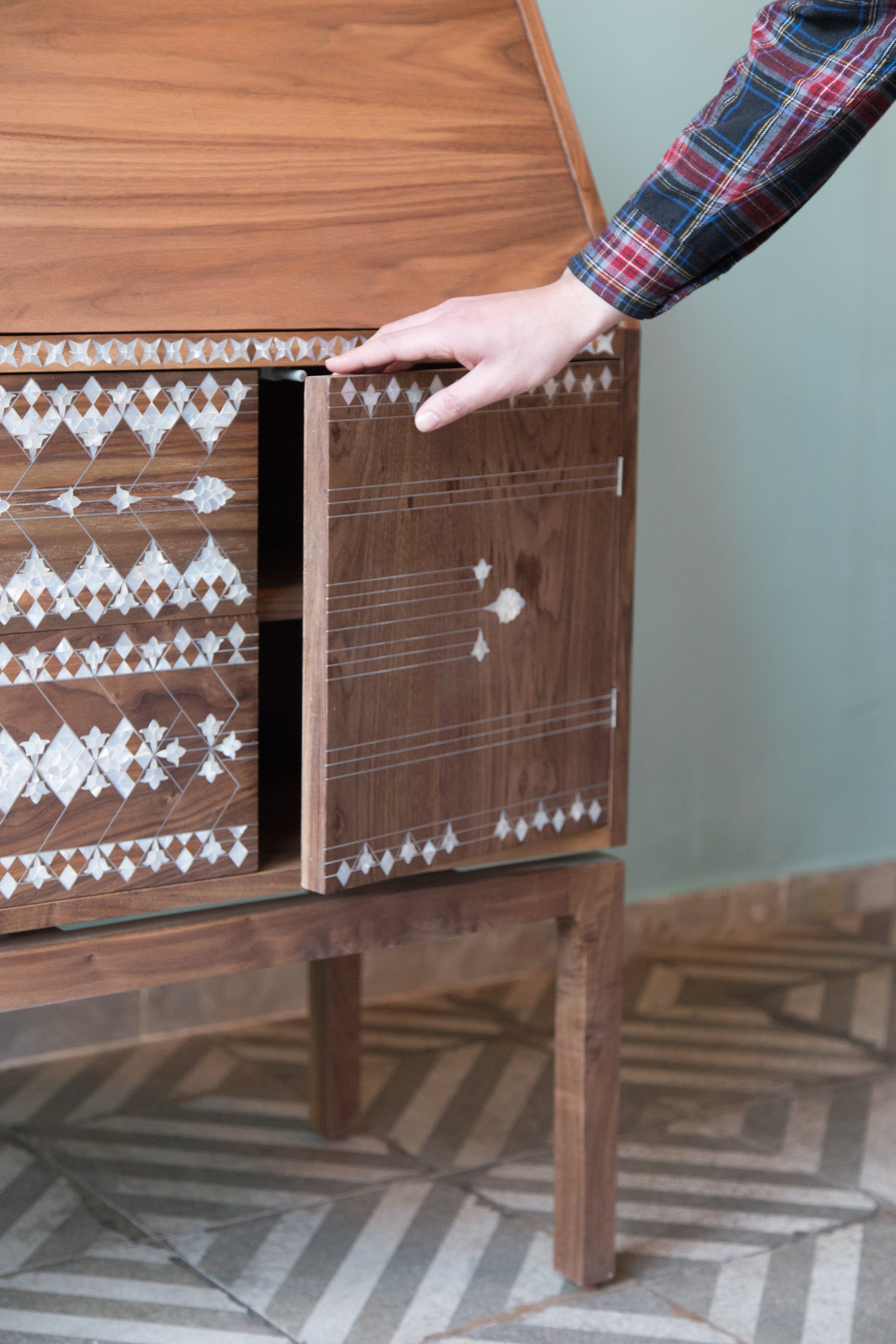 This secretary desk was designed as part of the “From concept to store” program, implemented by Turquoise Mountain with the support of UNICEF in 2021. The program was comprised of a team of a woodwork apprentice, a desiger and a master woodwork artisan to design and produce a handmade furniture piece that would later be showcased in the showroom of Turquoise Mountain. The desk’s form and pattern were telling the story of a shared nostalgic experience of the designer and the apprentice.