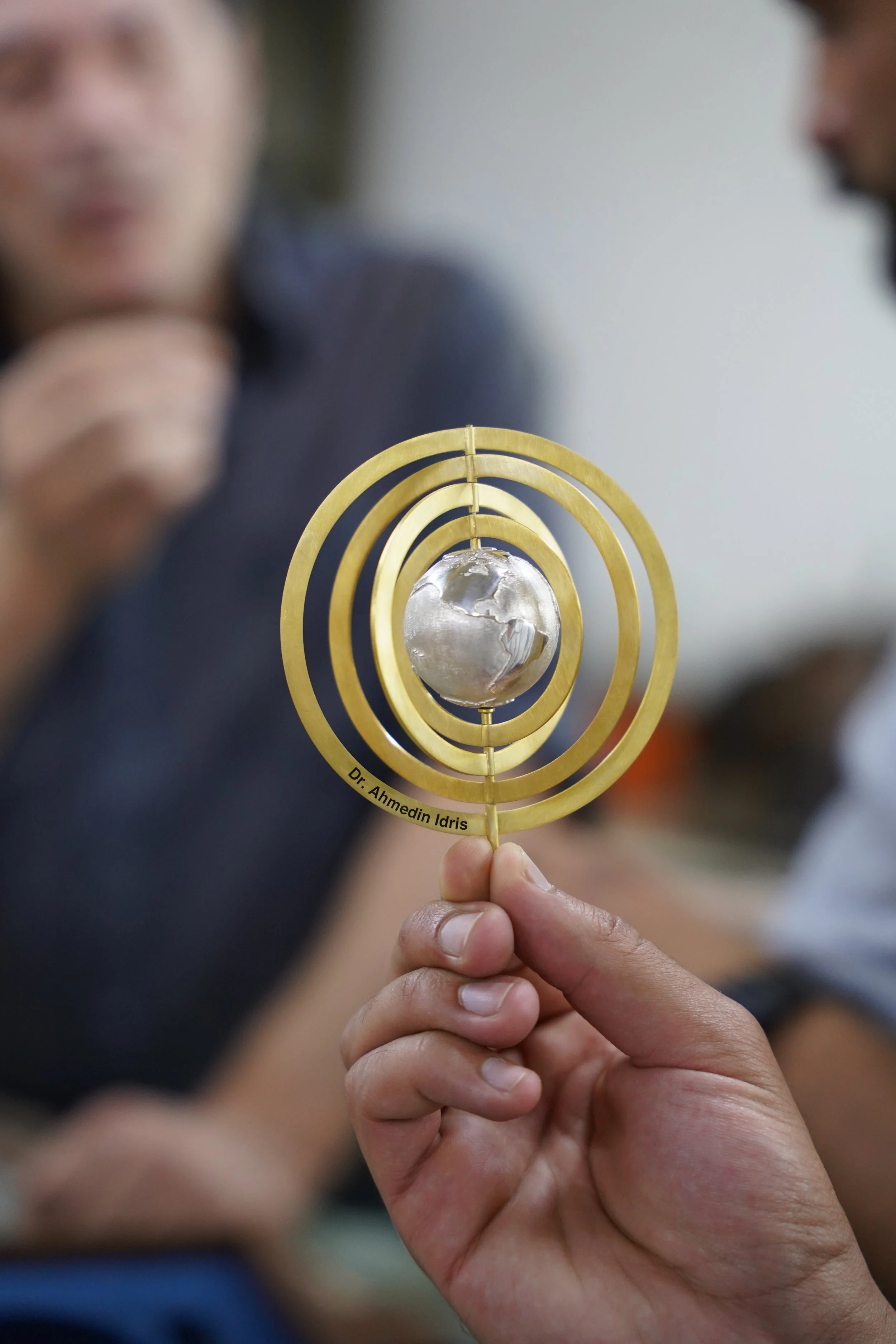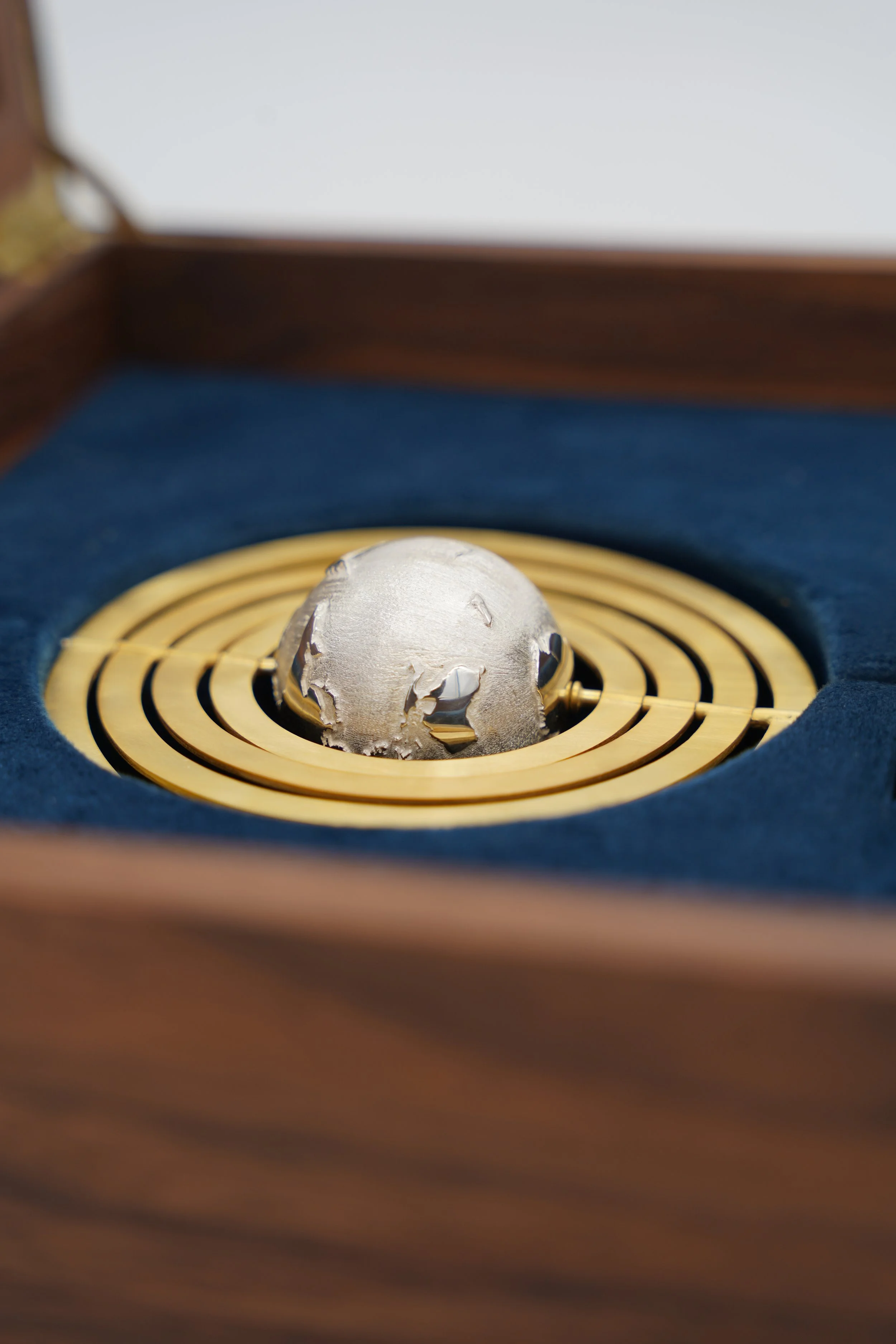 The design features an Earth globe with orbits that mechanically rotate around it. Making it requires a lot of skill and precision.
