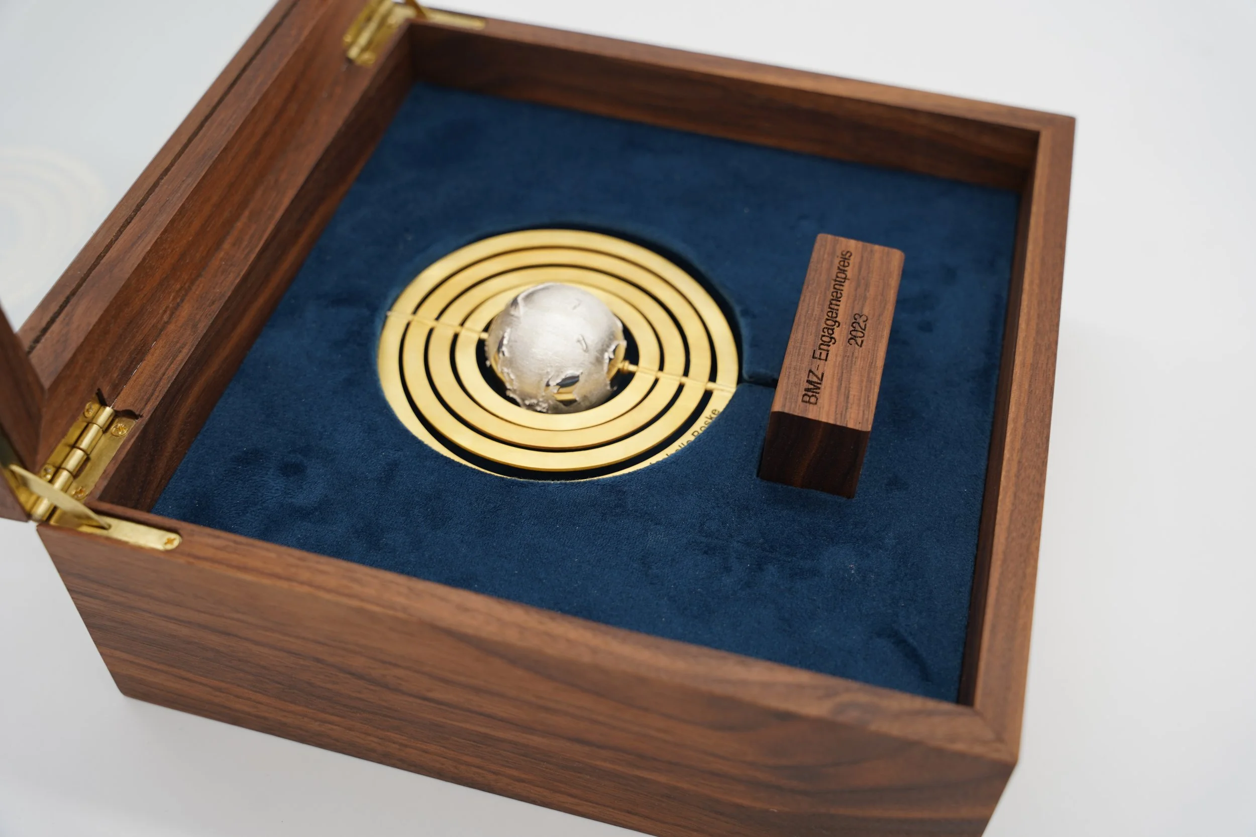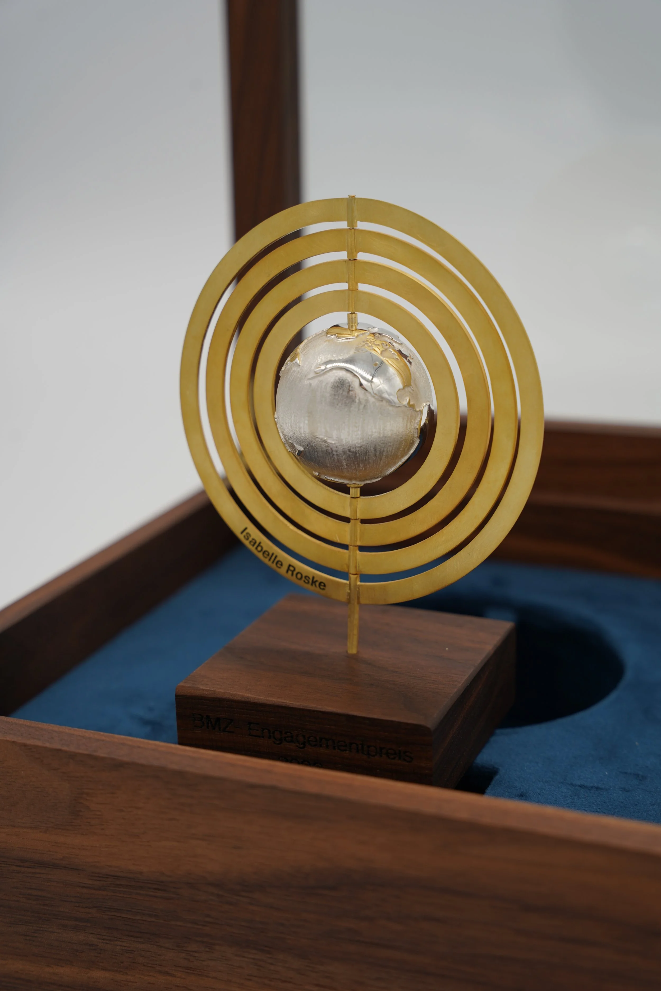 This trophy that is handmade from 925 Sterling Silver was designed at Turquoise Mountain Jordan for the One World Award which honors people and projects that make the world a better place. The project was facilitated through the Federal Ministry of Economic Cooperation and Development (Germany).